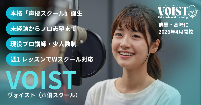 中央カレッジグループでは、2026年4月、群馬県高崎市に新たな教育機関として 声優スクール「VOIST(ヴォイスト)」 を開校いたします。