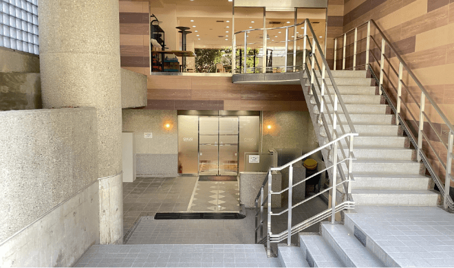 エレベーター前の階段を降りる