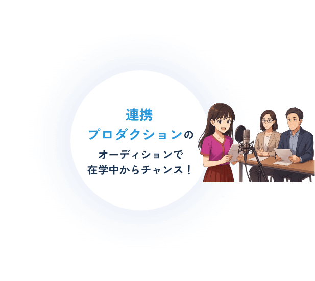 連携プロダクションによる推薦や特別オーディションのチャンスを通じて、あなたの夢の実現をバックアップします。