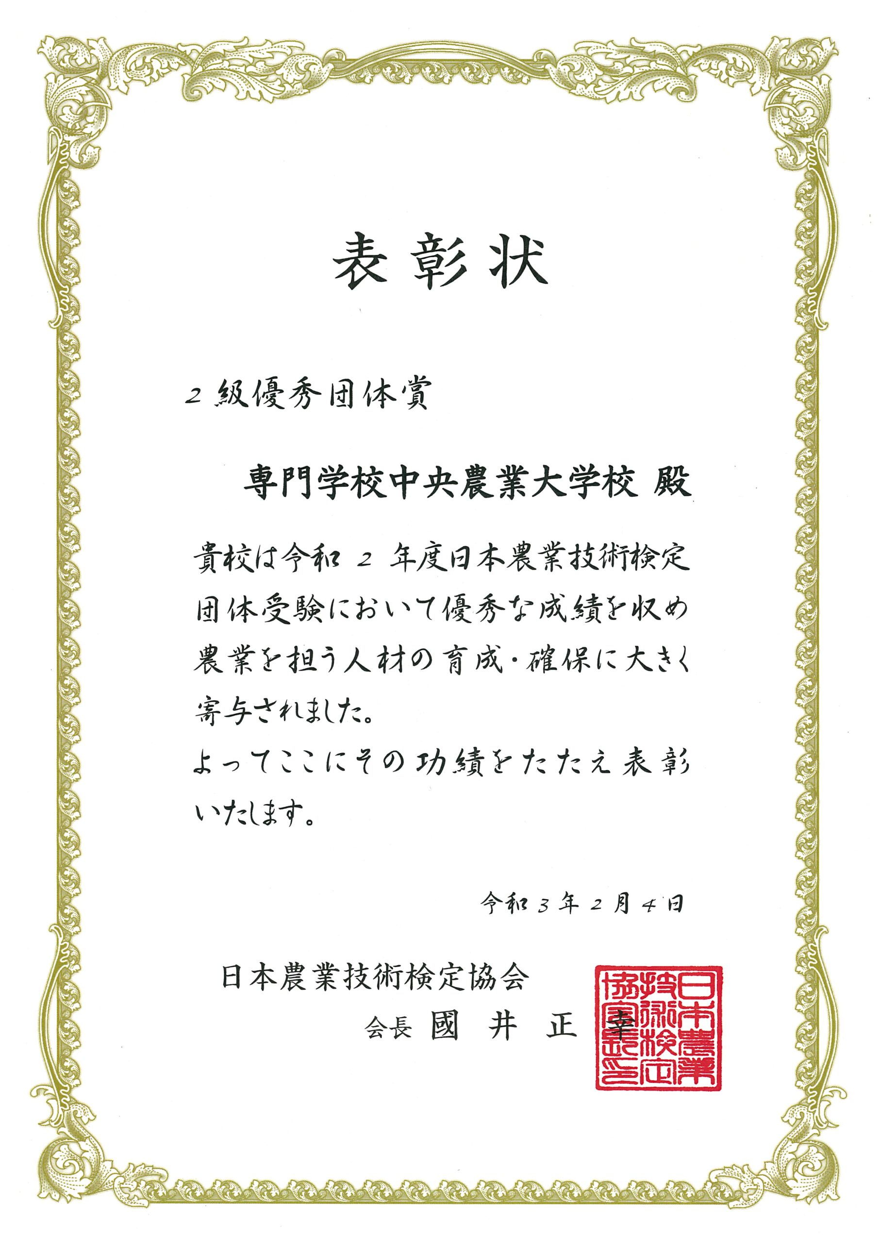 令和2年度日本農業技術検定 2級優秀団体賞