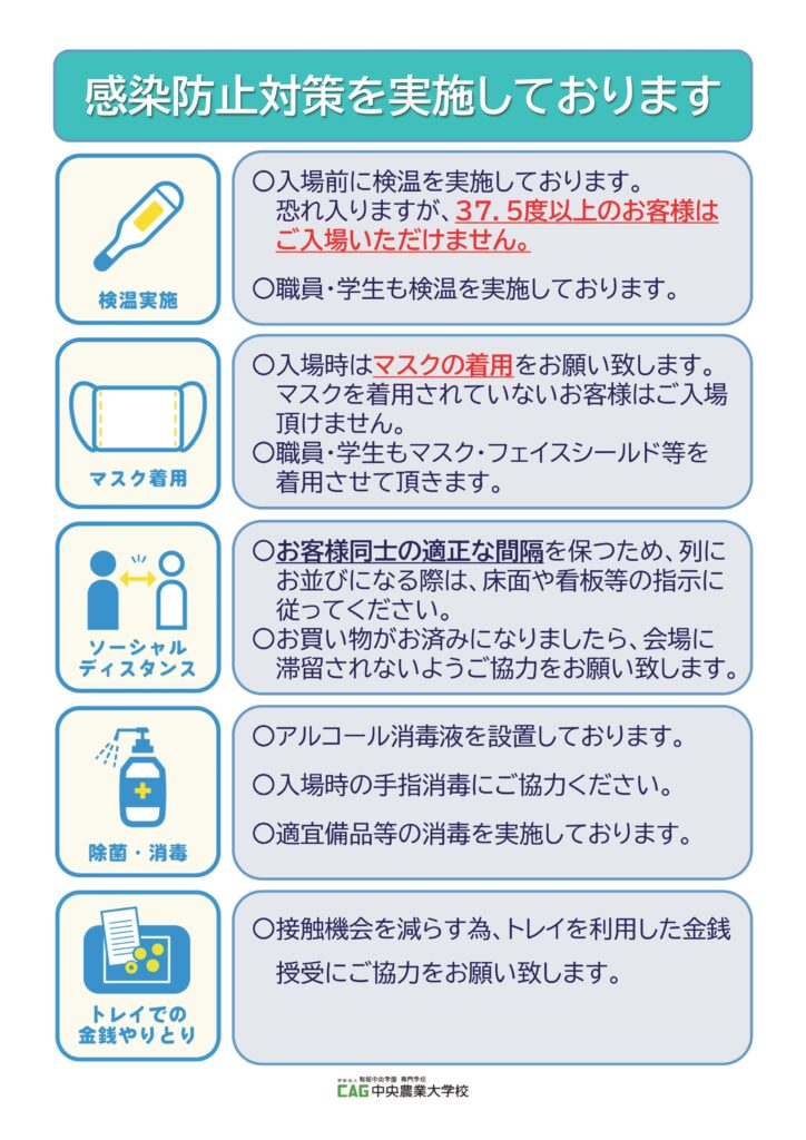 職員、学生は感染防止対策を実施しますが、ご来場の際には、ご面倒ですが、検温の上、マスクの着用をお願いします。