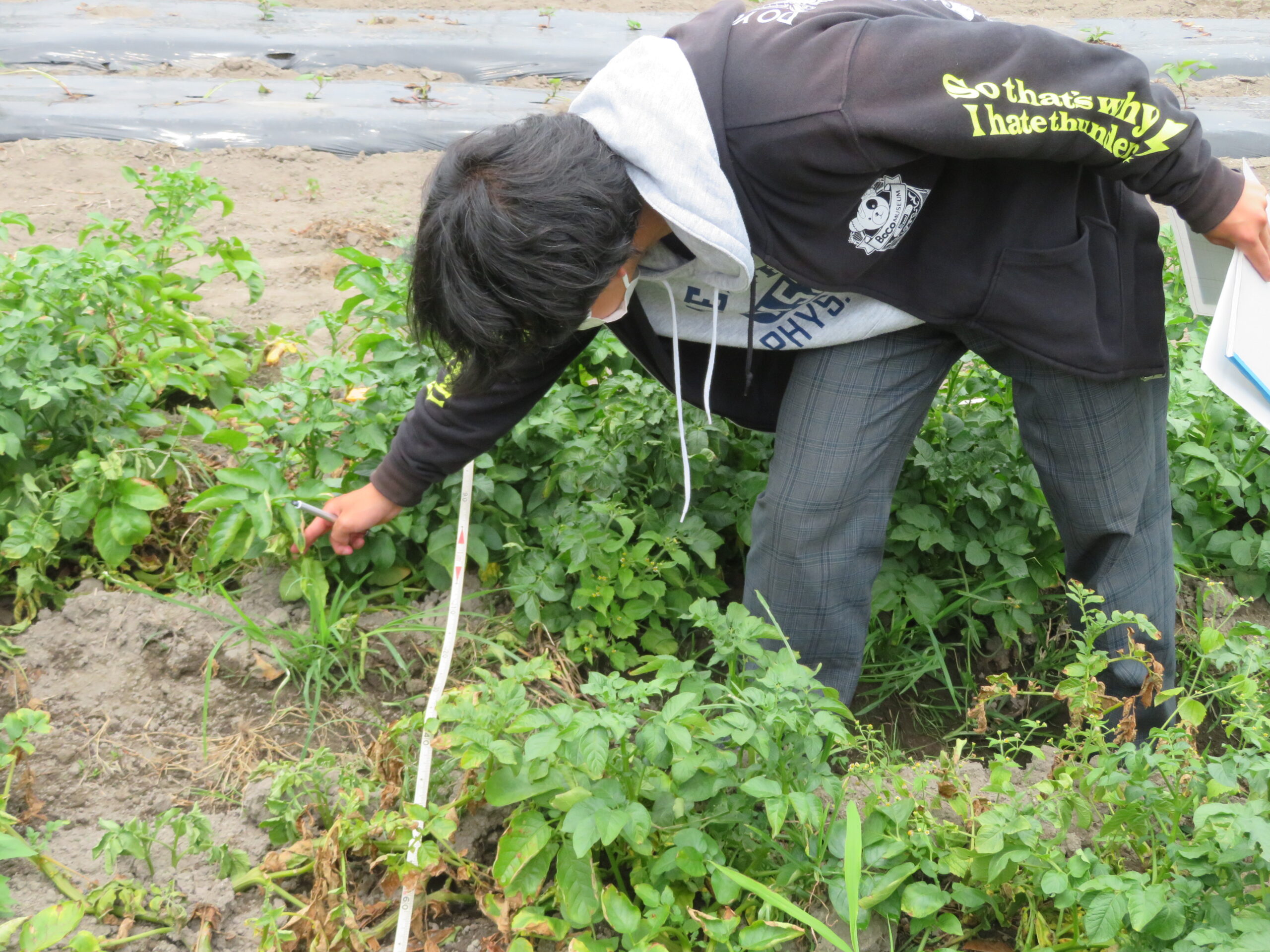 そこで、雑草が生えている収穫間近のジャガイモの畝(うね)で行いました。
