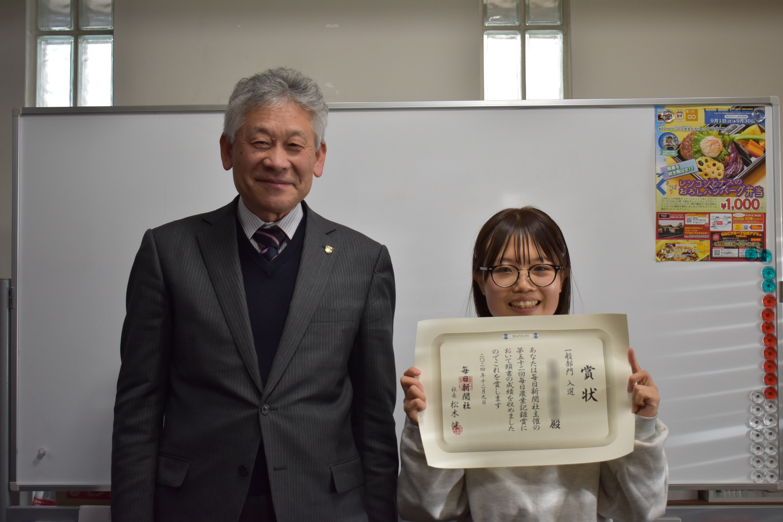 農や食、農に関わる環境への思いや体験をつづる第52回毎日農業記録賞(毎日新聞社主催)一般部門で、本校2年の富澤美彩音さんが見事入選に輝きました。