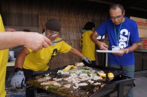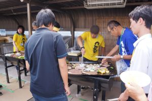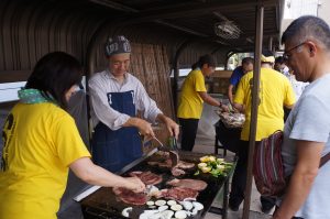 ジリジリと焼けつくような夏の日差しを受けながら肉をほおばる参加者の皆さん。