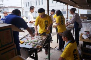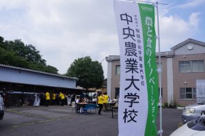 完成したばかりの「中央農業大学校」の旗が燦然とはためく駐車場の一角を飲食スペースにして行いました。