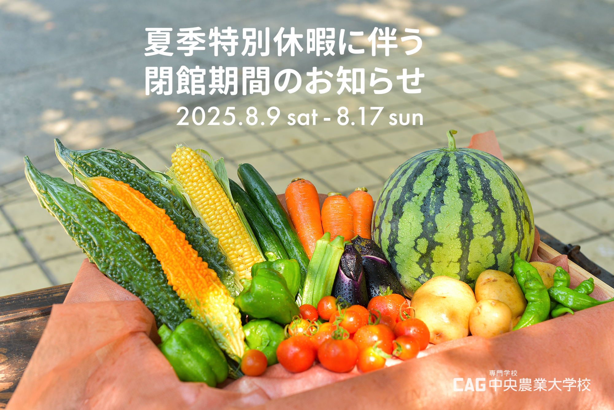【夏季休暇のお知らせ】 学校からのお知らせ 2025/07/25 誠に勝手ながら、下記の期間を夏季休暇とさせていただきます。 ■休暇期間:2025年8月9日(土)~8月17日(日) 上記期間中は、野菜直売、窓口業務および電話・メールでのお問い合わせ対応をお休みさせていただきます。(無人直売所につきましてはご利用いただけます。) 期間中にいただいた資料請求やお問い合わせにつきましては、8月18日(月)以降、順次対応させていただきます。 皆さまにはご不便をおかけいたしますが、何卒ご理解のほどお願い申し上げます。 共有: