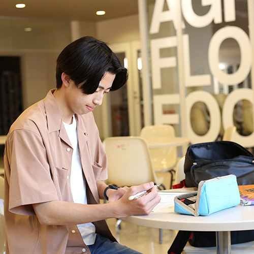 資格試験が近いので学生ホールで自主勉強をしています。ここで携帯で調べものをしたり、お友達と話したり、いつもここでのんびり過ごしています。