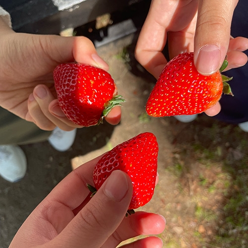 学校で作っているいちごを収穫し、仲良し三人組で食べました。自分たちで作ったものを味見するのも大事な勉強です。