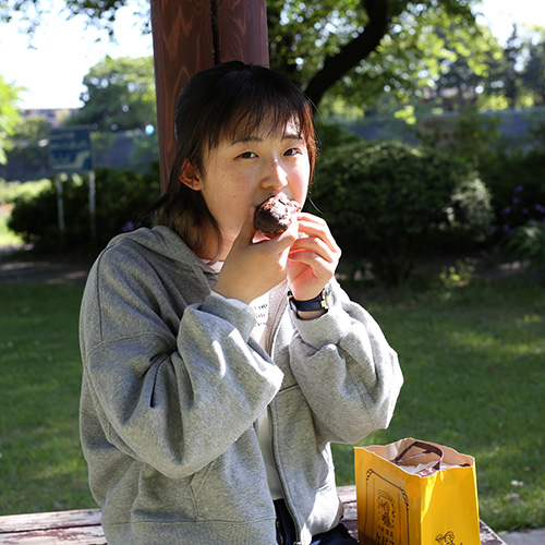 学校の前にある公園でお菓子を食べて一休みしています。授業で疲れた時、自然の中で食べる甘いものは格別です。