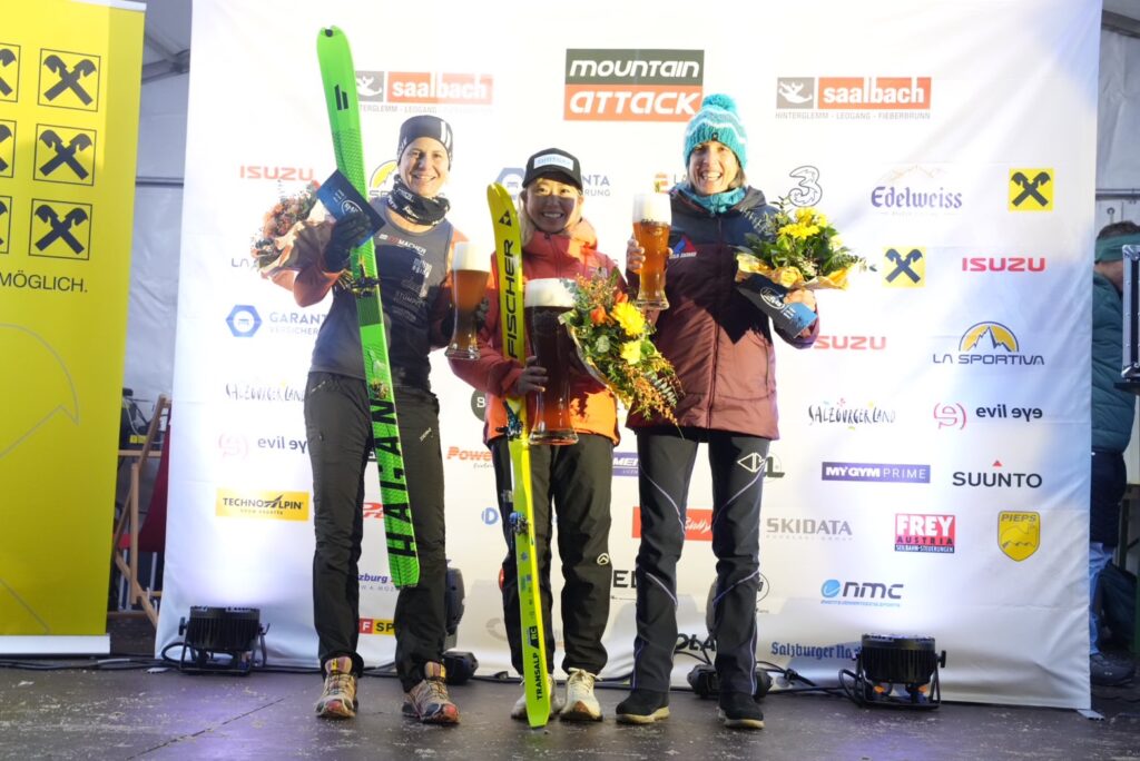 上田選手が優勝したSCHATTBERG-RACEは、スタート地点のSaalbachの街中を約500mスキーを担いで走った後、スキーを履いて3.2km・獲得標高1017mの斜面を登るものです。スキーアイゼンを必要とする70%を超える急斜面もある中、卓越した技術と精神力で他を圧倒しました。