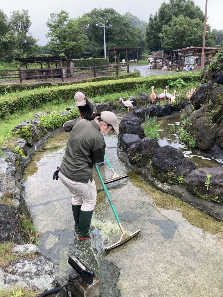 中央動物看護専門学校では、毎週木曜日に群馬サファリパークでの校外飼育実習が行われます。今回は、フラミンゴの池そうじについてお話ししたいと思います。 群馬サファリパークのウォーキングサファリゾーンに入ると、最初にあるのがフラミンゴの池です。池の中にはフラミンゴたちがのんびり過ごしています。池が汚れてしまうと、フラミンゴが滑ってしまいケガをする可能性があります。骨折は、フラミンゴにとって命取りになってしまうので池そうじは、フラミンゴたちの命を守るためにとても重要な業務です。