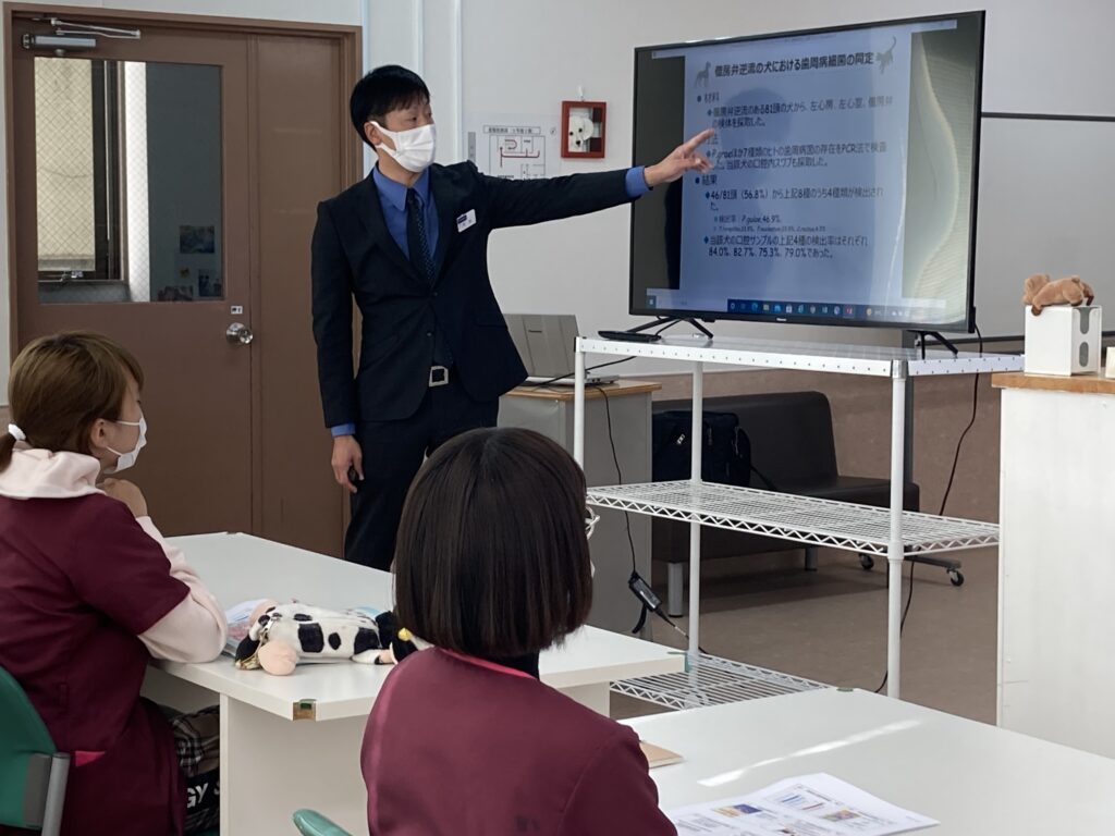 1回目は、動物用医薬品メーカーの方より歯周病の基礎知識やデンタルケア方法を分かりやすく教えていただきました。学生に対して質問も交えながらの講義だったので、学生たちもより積極的に講義を受けていました。