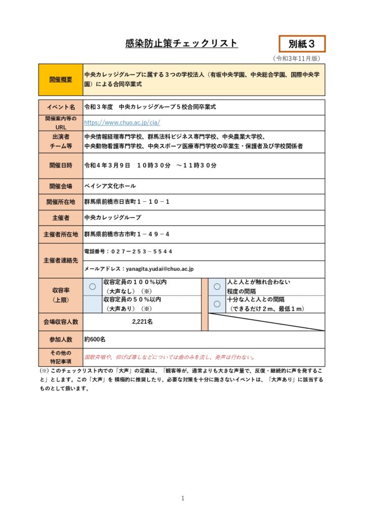 令和3年度 中央カレッジグループ5校合同卒業式における感染防止策について