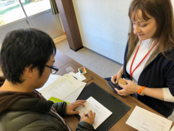▼ホテルのチェックイン手続き。必要事項を記入中。