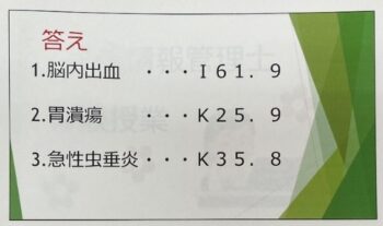本日は、①脳内出血 ②胃潰瘍 ③急性虫垂炎 についてコーディングしました。