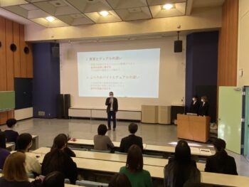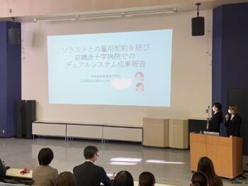 報告会では、経験しようと思ったきっかけやスタートまでの流れ、業務内容、業務を行う上で最も大事にしたことなどを発表しました。コミュニケーション力や医学知識など自分たちが感じた今後の課題やデュアルシステムを経験したことにより自分の成長につながったこと、1年生へのメッセージを送りました。