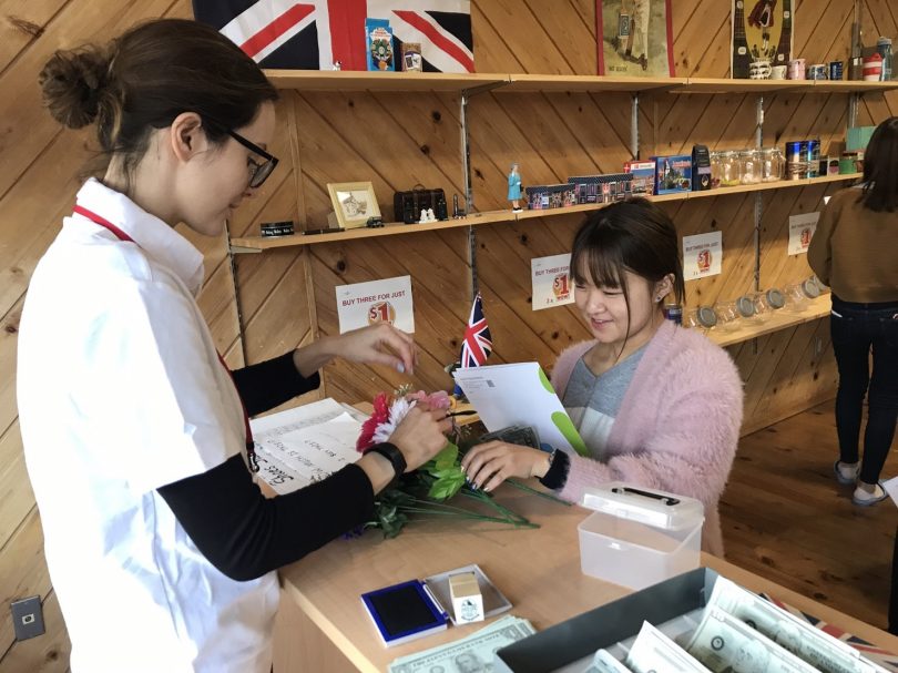 2つのグループに分かれ、「Hotel Reception」「Shopping」「Fast Food」の3つの場面で英語体験をしました。