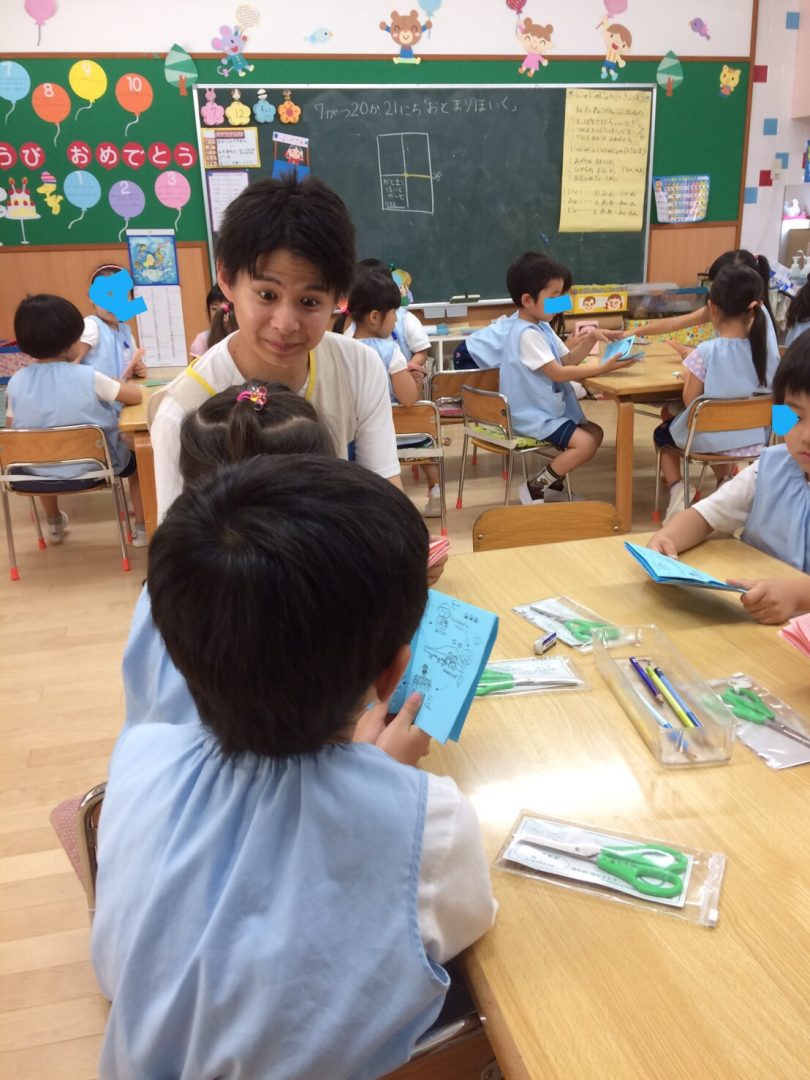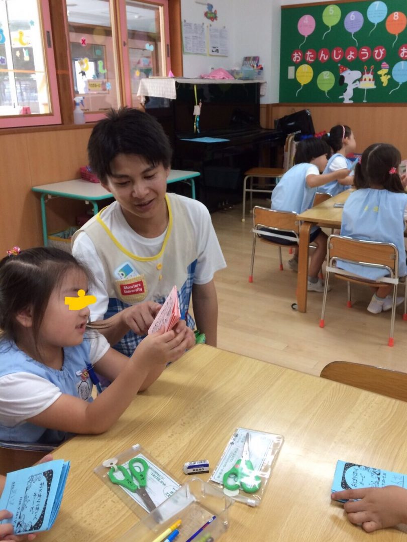 前橋市内の幼稚園で実習中!7月中に実施されるお泊り保育のしおり作りをしています。「おとまりほいくにいったらなにしようかなあ?」「おにいさんせんせいもいくの?」