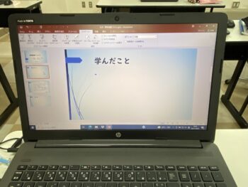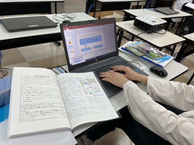 実習成果発表の準備をしている学生たちは、医療現場で何を学び、これからの自分たちに必要なものは何なのかを振り返り、それを分かりやすく伝えるためにパワーポイントにまとめています。