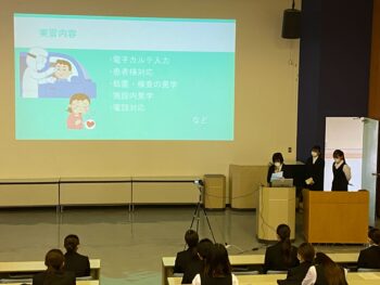 グループごとに、実習医療機関の特徴や実習内容をパワーポイントで発表してくれました。