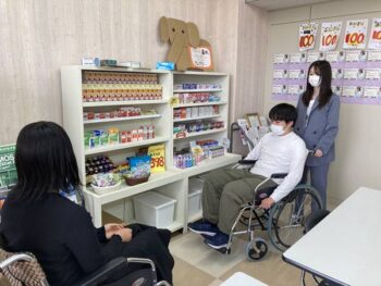 お客様が車いすで来店した場面を想定し、医薬品の棚を前に、