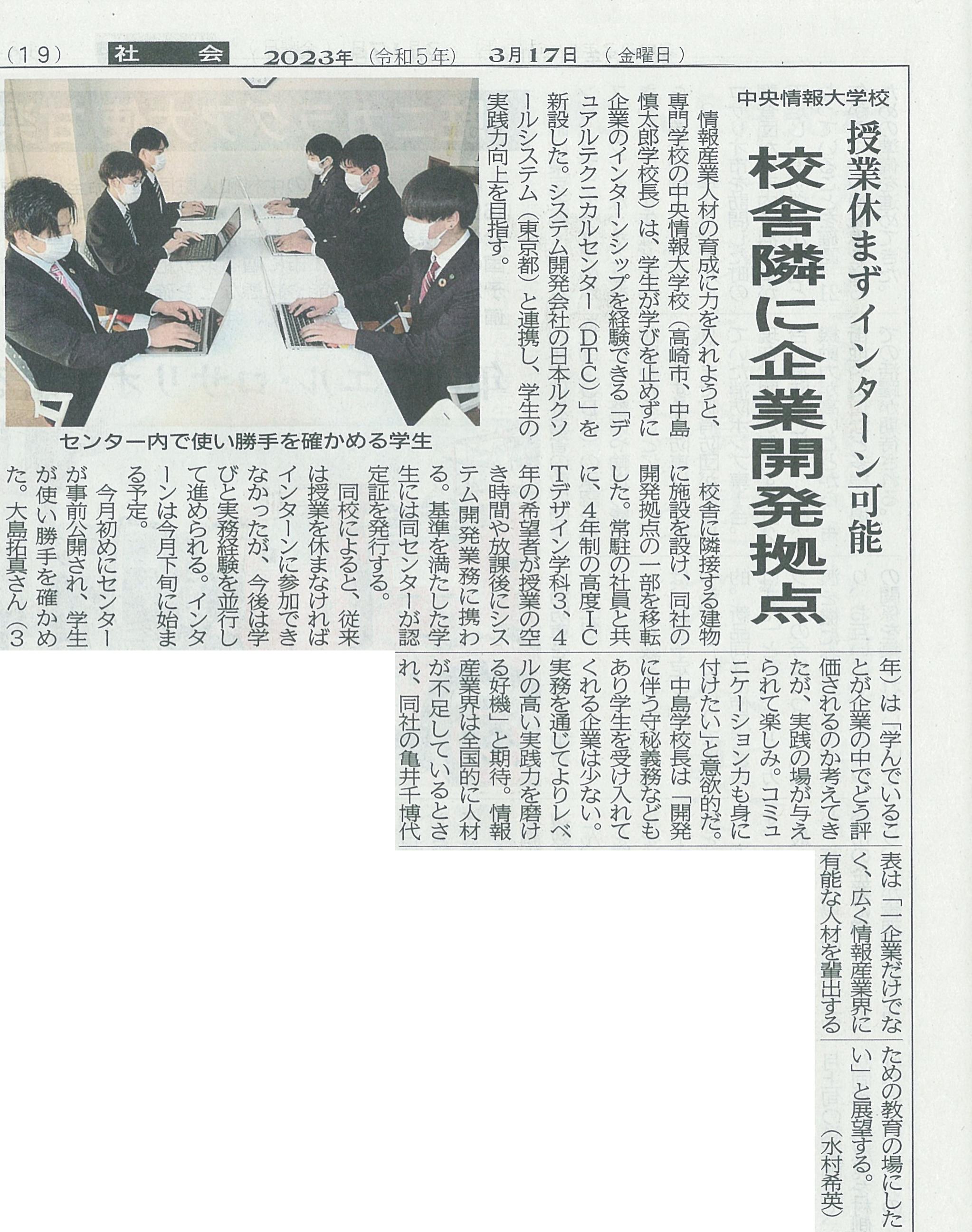 本校では、情報産業人材の育成を後押しするため、学生が学びを止めずに企業のインターンシップを体験できる「デュアルテクニカルセンター(DTC)」を学校に隣接する建物に新設しました。センター新設にあたり日本ルクソールシステム株式会社との連携も行います。