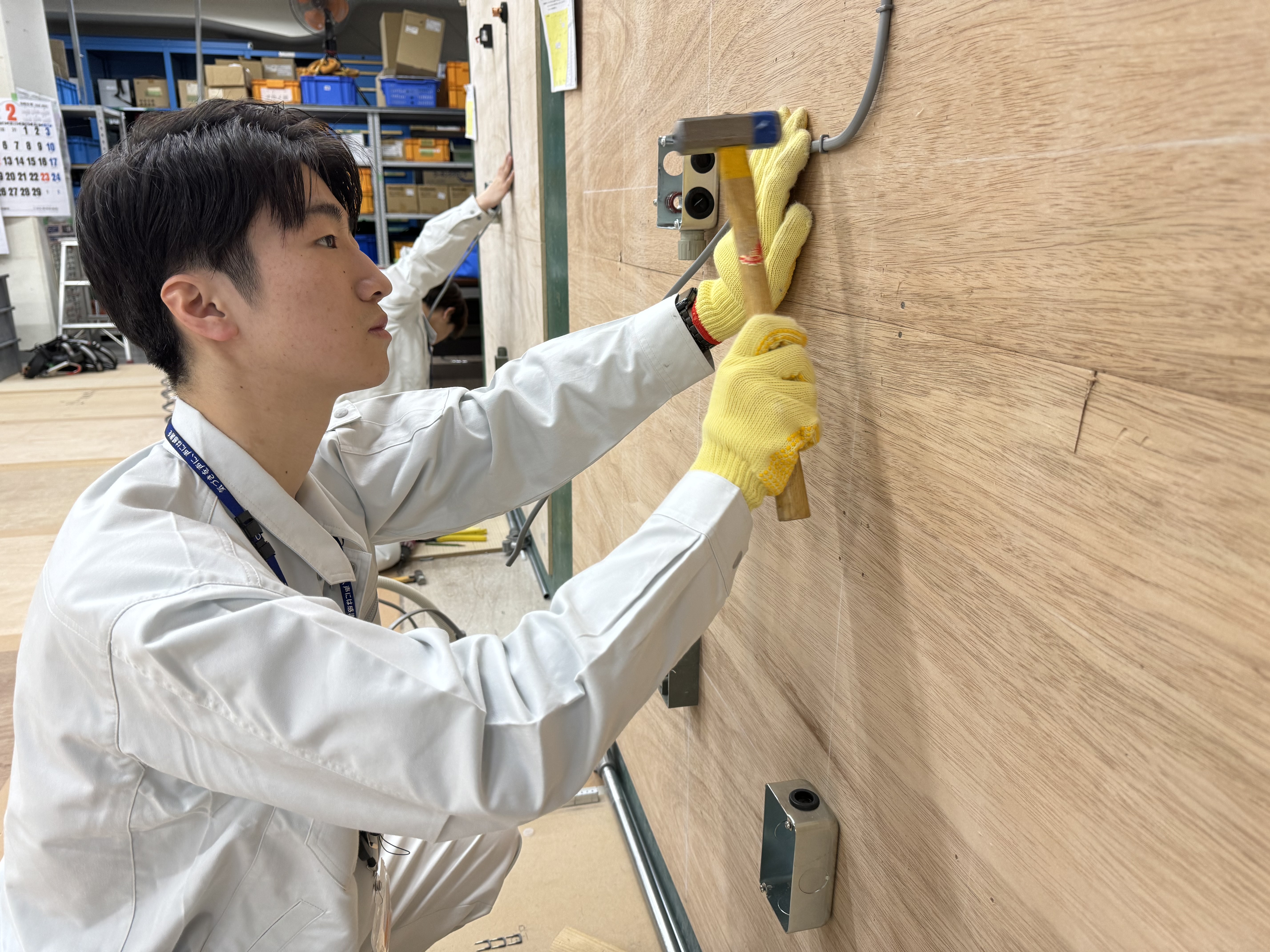 株式会社関電工では、低圧配管訓練が行われました。学生たちは現場で働くプロフェッショナルから直接指導を受けながら、造営材に電材を取り付ける作業を行いました。