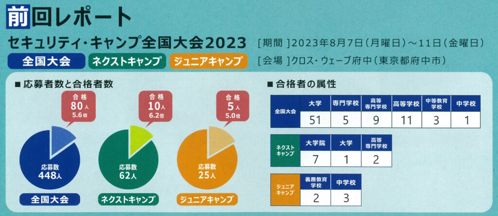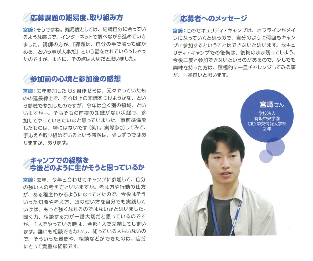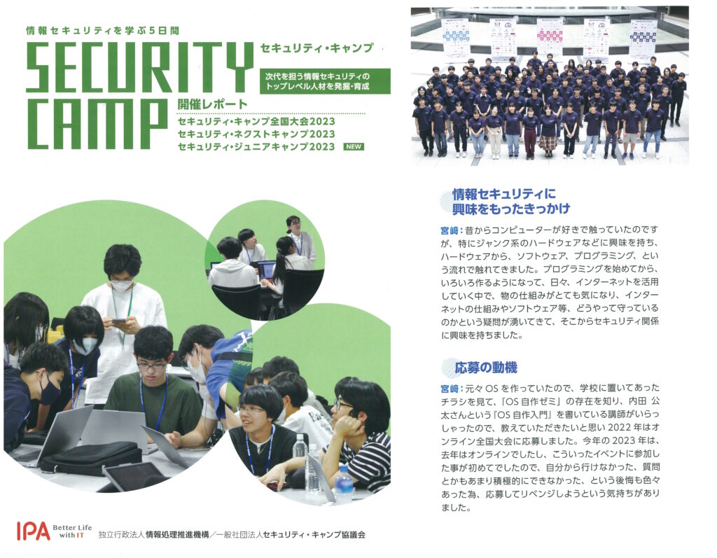 2023年8月7日にIPA 独立行政法人 情報処理推進機構が主催する「セキュリティ・キャンプ全国大会2023」に本校の学生の高度ICTデザイン学科の宮崎さん(当時2年生)が参加しました!