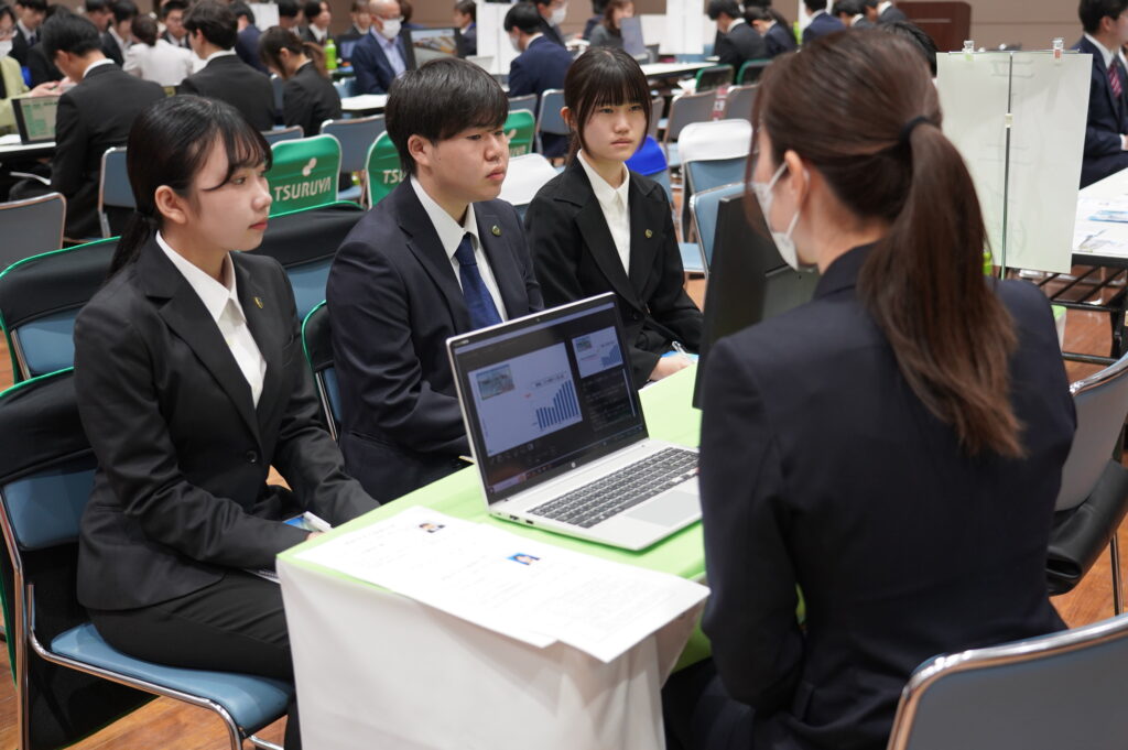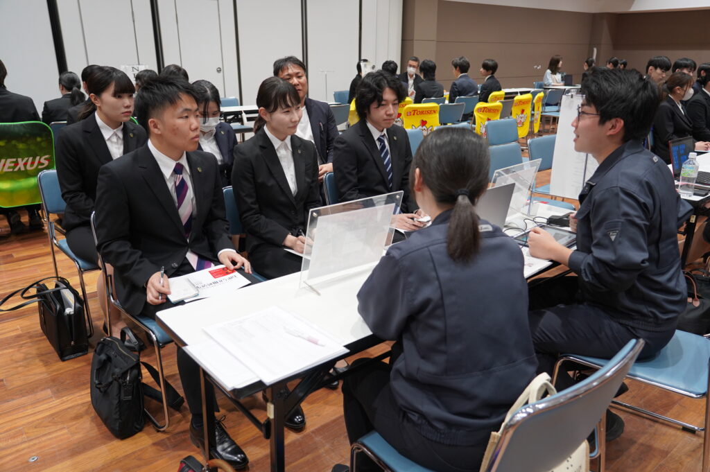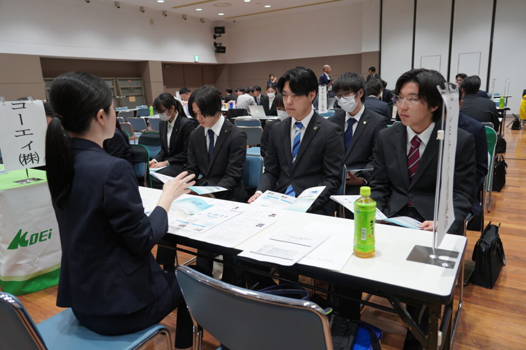 各企業ブースでは、会社のビジョンや業務内容、求める人材像などを直接お話しくださいました。学生たちは真剣な表情で耳を傾け、積極的に質問をしたり、熱心にメモを取りながら説明を聞いていました。