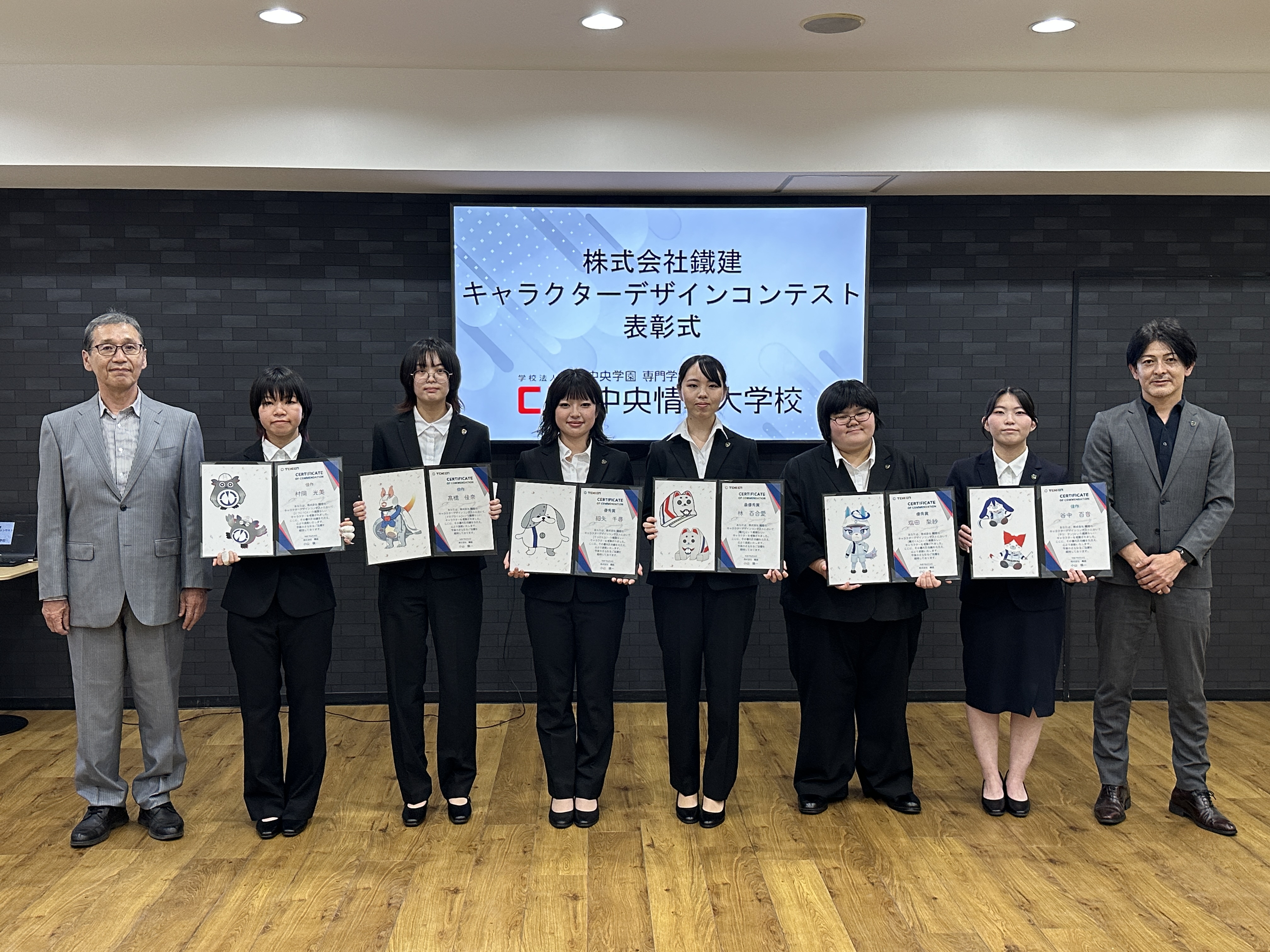 6月30日には、鐵建様が本校に来校し表彰式を実施しました。社長の小山さまからは、企業理念やポートレートカラーなど、どの作品もキャラクター制作をする上で必要な情報を組み込んであり、選考には大変悩んだと話されました。今後は、最優秀賞に輝いた作品を、名刺や封筒、パンフレット、HPなど様々なところで活用していきたいとのこと。
