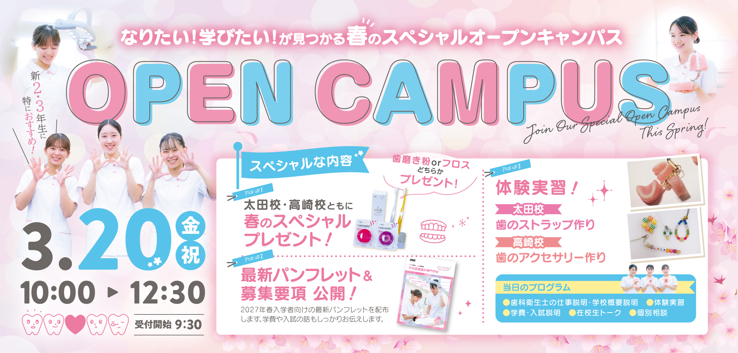 NEWS 年末年始休業のお知らせ 【クリスマスSP】オープンキャンパス 高崎校 【クリスマスSP】オープンキャンパス 太田校 【重要】入試提出書類ダウンロードについて 出願スタート TOPICS OPENCAMPUS2025-26 オープンキャンパス情報 参加者には、歯科グッズをプレゼント! 自分の未来を体験してみよう! ONLINEInformationSession オンライン学校説明会 学校のこと、入試のことなど、 何でも気になる事を質問・相談していただき、 進学への不安を解消しましょう。 INFORMATION> 一覧を見る 2025.12.16 お知らせ 年末年始休業のお知らせ 2025.11.28 高崎校 【クリスマスSP】オープンキャンパス 高崎校 2025.11.28 太田校 【クリスマスSP】オープンキャンパス 太田校 2025.10.02 お知らせ 【重要】入試提出書類ダウンロードについて 2025.10.01 入学試験 出願スタート FEATURE中央医療歯科専門学校の特徴 月・火・水・金曜日の授業は13:20に終了。放課後は自分らしく、自由に活動できます。 本校の特徴について詳しく知る 放課後は歯科医院でアルバイト(実践的に学ぶ)や自己学習の時間として使うことができます。 本校の特徴について詳しく知る Instagram 太田校 cis2003start cis2003start 合同学園祭の準備を進めています! さらに読み込む Instagram でフォロー 高崎校 cms_dental_school_takasaki cms_dental_school_takasaki 🦷 〜ゴールデンウィーク期間 休業 🥯 新学期最初のお昼休み🍙 今日は 🦷 今日はオープンキャンパスでした さらに読み込む Instagram でフォロー キャリア形成の機会を拡大!留学生はこちら