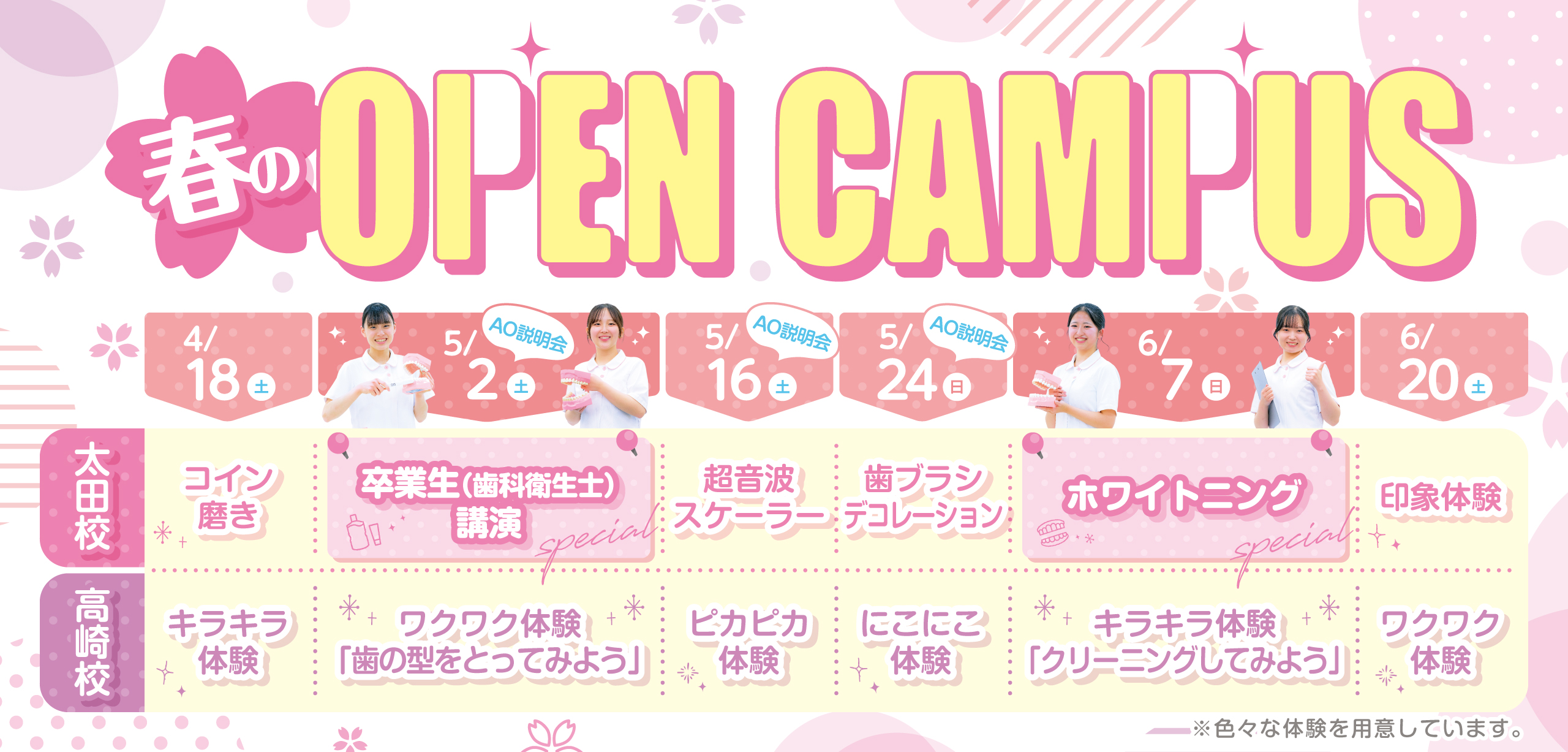NEWS 春のスペシャルオープンキャンパス!! 春のスペシャルオープンキャンパス!! 既卒者向け学校説明会を行います! オープンキャンパス オープンキャンパス TOPICS OPENCAMPUS2025-26 オープンキャンパス情報 参加者には、歯科グッズをプレゼント! 自分の未来を体験してみよう! ONLINEInformationSession オンライン学校説明会 学校のこと、入試のことなど、 何でも気になる事を質問・相談していただき、 進学への不安を解消しましょう。 INFORMATION> 一覧を見る 2026.03.16 太田校 春のスペシャルオープンキャンパス!! 2026.03.16 高崎校 春のスペシャルオープンキャンパス!! 2026.02.02 太田校 既卒者向け学校説明会を行います! 2026.01.28 太田校 オープンキャンパス 2026.01.28 高崎校 オープンキャンパス FEATURE中央医療歯科専門学校の特徴 月・火・水・金曜日の授業は13:20に終了。放課後は自分らしく、自由に活動できます。 本校の特徴について詳しく知る 放課後は歯科医院でアルバイト(実践的に学ぶ)や自己学習の時間として使うことができます。 本校の特徴について詳しく知る Instagram 太田校 cis2003start cis2003start 合同学園祭の準備を進めています! さらに読み込む Instagram でフォロー 高崎校 cms_dental_school_takasaki cms_dental_school_takasaki 🦷 〜ゴールデンウィーク期間 休業 🥯 新学期最初のお昼休み🍙 今日は 🦷 今日はオープンキャンパスでした さらに読み込む Instagram でフォロー キャリア形成の機会を拡大!留学生はこちら