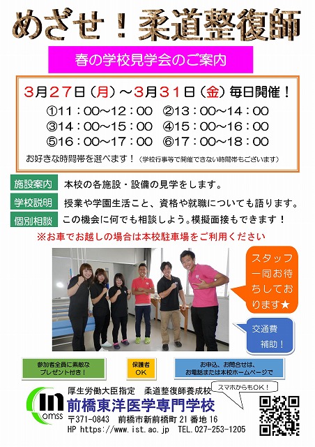 3月27日~3月31日にかけて、春の学校見学会を開催します。個別対応で分かりやすく説明いたしますので、是非参加してみてください!