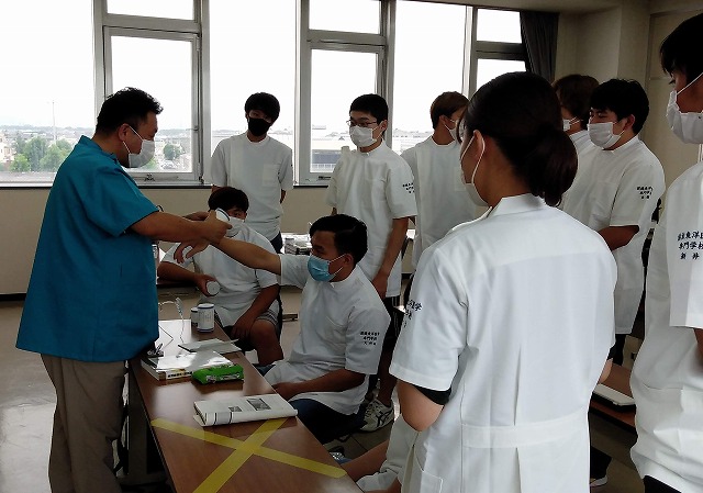 7月6日(月)より、包帯巻き等の実習が可能となりました。マスクまたはフェースガードを着用し、ソーシャルディスタンスを保ちつつの授業ですが、やっと柔道整復科らしい授業が開始できるようになりました。