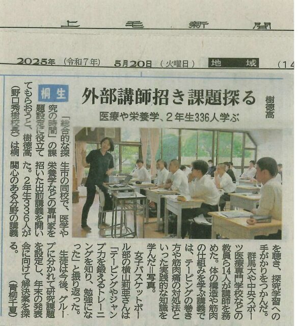 記事によると、「総合的な探求の時間」として樹徳高校の2年生336人が医学や栄養学をテーマに課題を探る取り組みの一環として、永井教員が外部講師として招かれました。「カラダの仕組みを知ろう」といったテーマで、生徒たちにテーピングの巻き方や筋肉痛の対処法,身体能力を高めるトレーニングなどを、講義と体験を交えながら行いました。
