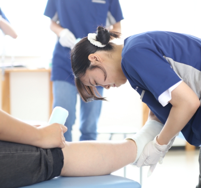 柔道整復師ならではの包帯やテーピングを巻く授業では、普段経験することが出来ないことなので、楽しさとやりがいを感じます。昨年はスポーツ大会も無事に開催することができました。他学年の学生とも協力し合いながら、体を動かすことが出来る楽しい行事でした。