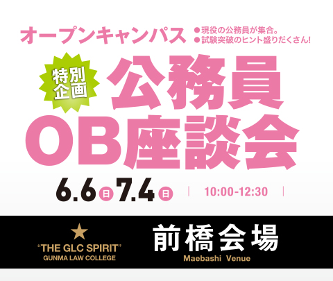 群馬法科ビジネス専門学校恒例のイベント、公務員OB座談会SP〔スペシャル〕を今年も開催。当校の卒業生で現役の公務員が集合し、仕事のこと、試験勉強の体験談など様々な話しを聞かせてくれます。毎年たくさんの公務員合格者を輩出している本校だからこそできる企画。普段は聞けない話しが満載です。個別での質問や相談も大歓迎です。