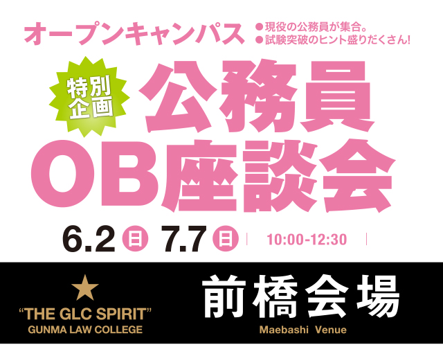 群馬法科ビジネス専門学校恒例のイベント、公務員OB座談会SP〔スペシャル〕を今年も開催。当校の卒業生で現役の公務員が集合し、仕事のこと、試験勉強の体験談など様々な話しを聞かせてくれます。毎年たくさんの公務員合格者を輩出している本校だからこそできる企画。普段は聞けない話しが満載です。個別での質問や相談も大歓迎です。