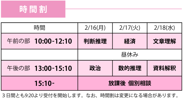 開講科目:判断推理・数的推理・文章理解・資料解釈・政治・経済