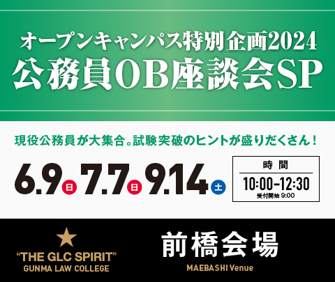 群馬法科ビジネス専門学校恒例のイベント、公務員OB座談会SP〔スペシャル〕を今年も開催。当校の卒業生で現役の公務員が集合し、仕事のこと、試験勉強の体験談など様々な話を聞かせてくれます。毎年たくさんの公務員合格者を輩出している本校だからこそできる企画。普段は聞けない話しが満載です。個別での質問や相談も大歓迎です。