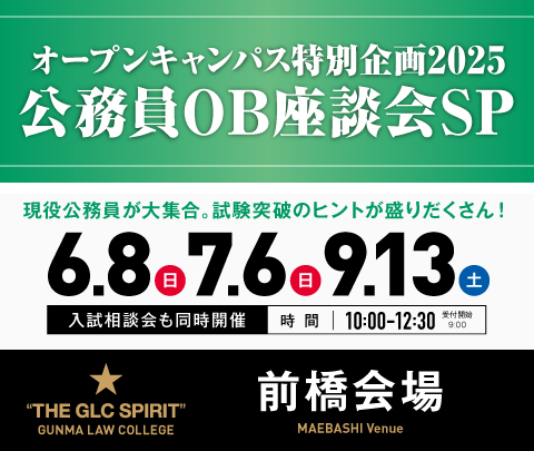 群馬法科ビジネス専門学校恒例のイベント、公務員OB座談会SP〔スペシャル〕を今年も開催。当校の卒業生で現役の公務員が集合し、仕事のこと、試験勉強の体験談など様々な話を聞かせてくれます。毎年たくさんの公務員合格者を輩出している本校だからこそできる企画。普段は聞けない話しが満載です。個別での質問や相談も大歓迎です。