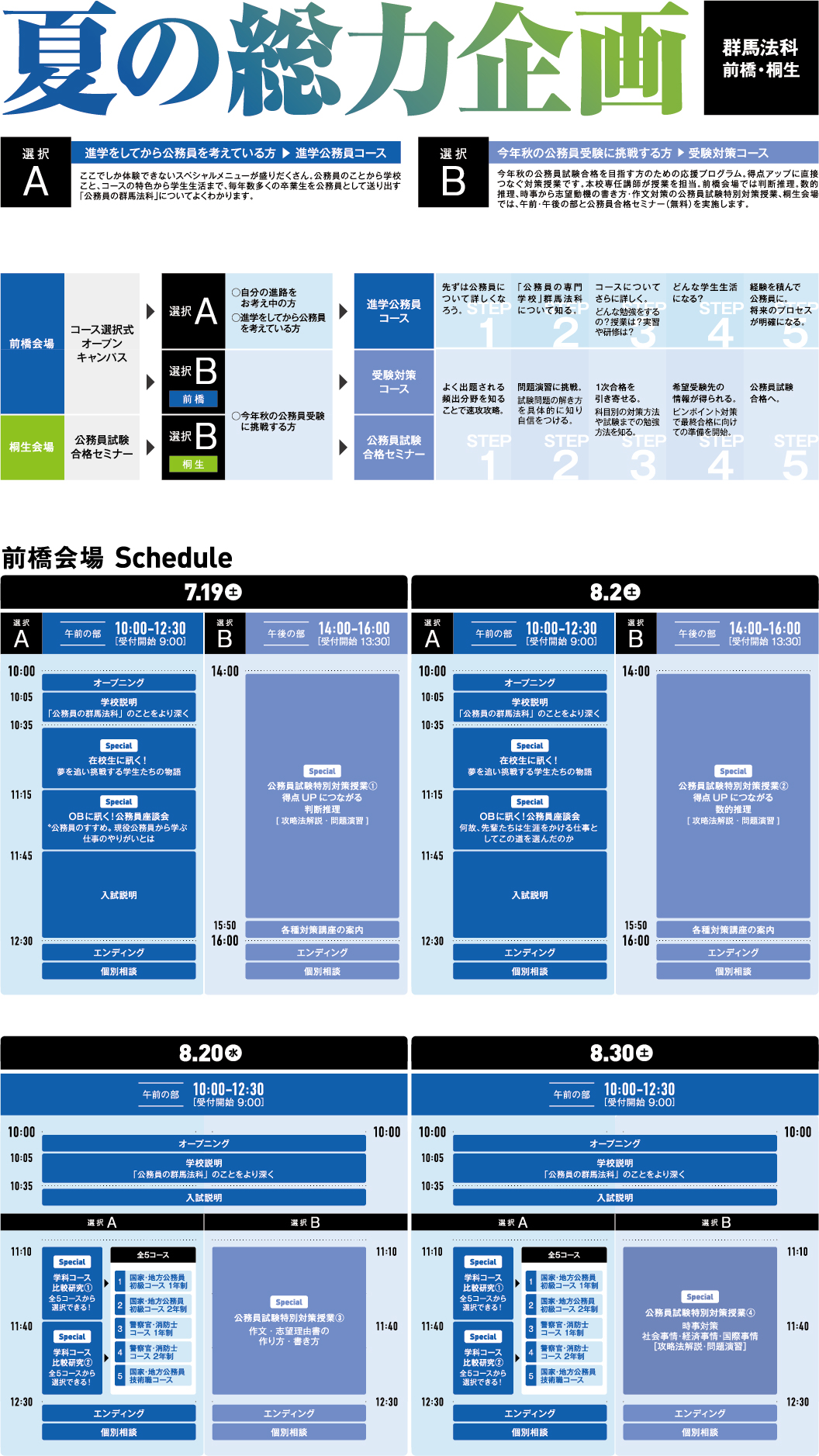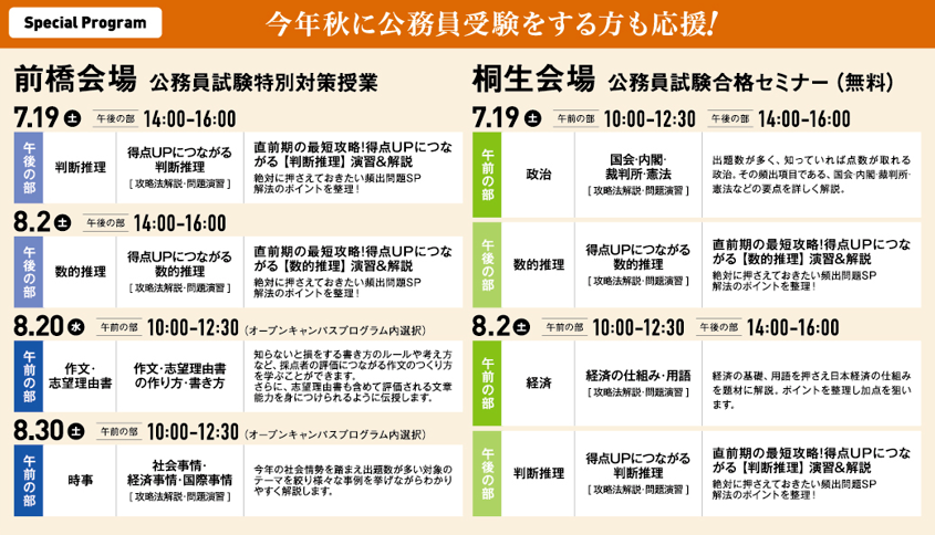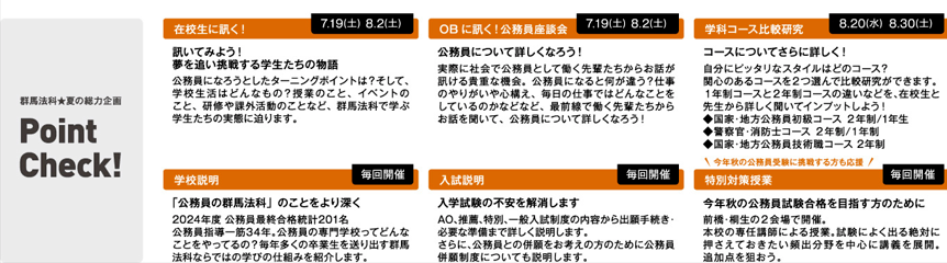進路研究から公務員受験対策まで、皆さんの目的に合わせたプログラムをご用意。公務員の仕事内容にとどまらず、公務員になるまでのプロセスがよくわかります。公務員に興味のある方はもちろん、自分の進路を考え中の方も大歓迎!さらに、毎年、多くの卒業生を公務員として送り出す群馬法科の仕組みも紹介。また、公務員を今年秋の公務員受験に挑戦する方のためには特別対策授業も増設。夏にしか体験できない群馬法科の総力を上げたスペシャルイベント。百聞は一見に如かず。ぜひお越しください。