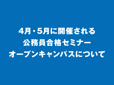 新型コロナウイルスの感染が国内に拡大している状況を受け、4月18日(土)・5月9日(土)に開催される予定の公務員合格セミナー2020、オープンキャンパスについて内容を変更して行います。参加をご検討くださっていた皆様には心よりお詫び申し上げます。現在の社会情勢を踏まえ、皆様の安全面を最優先に考慮しての判断ということをご理解いただきたくお願い申し上げます。