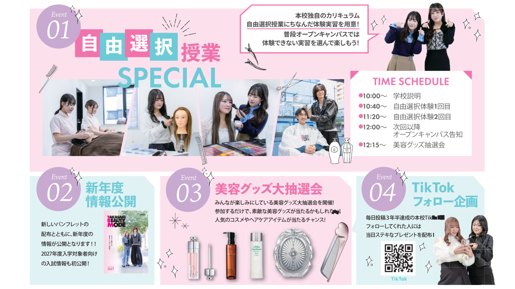 普段のオープンキャンパスでは体験できない、マツエク、フォト、色彩や着付けなどのい実習をご用意!