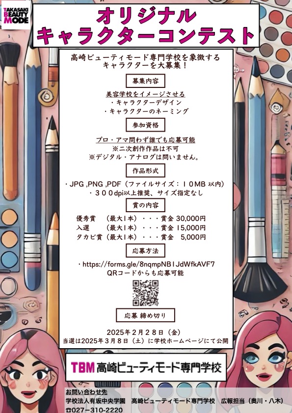 タカビ オリジナルキャラクターコンテスト ◾️概要 高崎ビューティモード専門学校では、今後様々な場所で活躍する 「オリジナルキャラクター」作品を募集中です。 ◾️趣旨 高崎ビューティモード専門学校は、美容業界や地域の皆さんから親しまれ、 愛される「オリジナルキャラクター」のデザインと「ネーミング...
